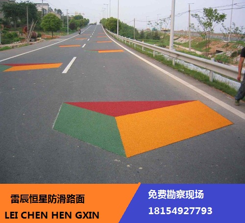 防滑涂層由黏合劑及防滑骨料組成,涂層表面可撒布玻璃微珠。成型后涂層的顏色主要為紅、綠、黃、藍(lán)。目前按施工方法來(lái)分,有熱熔型和冷涂型。